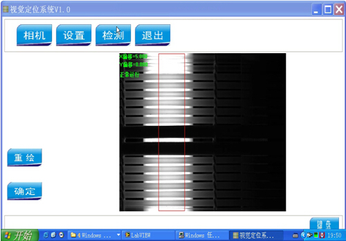 本系統(tǒng)包含視覺定位以及點(diǎn)膠控制兩個部分。視覺系統(tǒng)采用高分辨率工業(yè)相機(jī),在連續(xù)模式下,實(shí)時監(jiān)控檢測圖像中是否出現(xiàn)竹簽圖像,當(dāng)視覺檢測到竹簽后,視覺系統(tǒng)發(fā)送停機(jī)信號給點(diǎn)膠控制系統(tǒng),點(diǎn)膠控制系統(tǒng)收到停機(jī)信號后,停止傳輸帶。并發(fā)送定位信號給視覺系統(tǒng),視覺系統(tǒng)收到定位信號后,檢測圖像中竹簽位置,并發(fā)送竹簽坐標(biāo)信息給控制系統(tǒng)。控制系統(tǒng)收到坐標(biāo)信息后,控制點(diǎn)膠頭移動到竹簽位置,并點(diǎn)膠。點(diǎn)膠完畢,發(fā)送開始檢測信號給視覺系統(tǒng),如此循環(huán)。