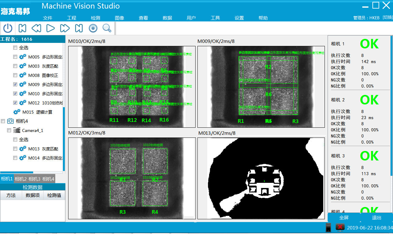 “HK-V6500N視覺控制器”,應(yīng)用于四相機LED缺陷檢測,搭載視覺處理軟件MVS,采用交叉點定位或者匹配定位基于二值化、圖像校正插件、LED極性判斷、LED缺角檢測、LED亮色缺陷檢測、LED邊緣變形檢測等插件,實現(xiàn)LED缺陷檢測能。