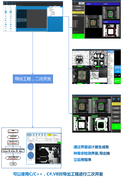 自定義檢測界面,用戶logo,圖像顯示,圖形顯示,參數控制按鈕,表格,圖表,運行控制按鈕,統計,界面布局,界面停靠,多界面,多界面控制按鈕,自定義顯示文字 ,界面顏色控制 ,界面字體控制,導出可執行exe,導出C,C#方便二次開發。支持界面控件快速擴展。